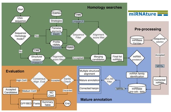 Workflow of miRNAture. The starting point is the provided set of target sequence by the user, which is first analyzed in Homology search mode to detect miRNA candidates. Specifically, two strategies are available: sequence homology and structural validation. The first one using pairwise alignments, performed with blastn, or hidden markov models (HMMs) using nhmmer. The second one is based on the use of covariance models (CMs). Each of the described stages has their own filters, accepted candidates being submitted to the next stage while discarded candidates are reported separately for later manual inspection. A merging step produces a final list of homology candidates. After that, Mature annotation stage runs on these input sequences and performs a correction of the positioning of mature sequences on the hairpin, generating a correctly anchored family-specific-multiple secondary structure alignment (calculated by MIRfix []). The Evaluation stage starts with a sanity check that reviews the mature annotation and performs a comparison of conserved secondary structures with and without the newly annotated candidates. Based on this classification the candidates will be labeled as accepted or discarded. Sequence length and minimum free energy (MFE) cutoffs are used for further filtering. A final set of candidates is reported in BED/GFF3 annotation formats and FASTA files. A summary file provides overall information about the miRNA candidates and families and contains additional candidates which failed or have not been considered for evaluation due to cutoffs for manual inspection.