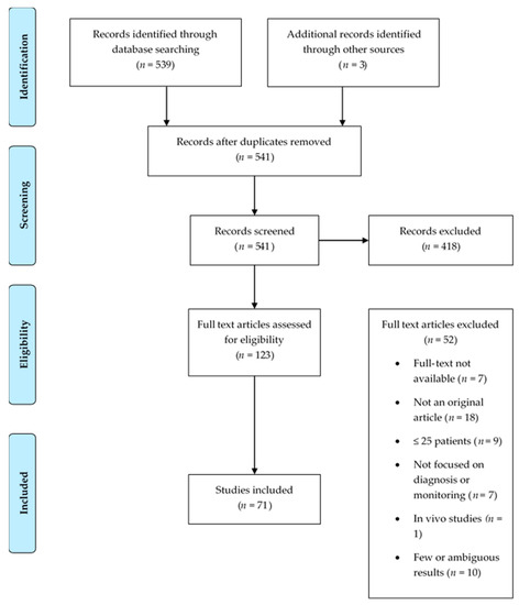 Only original articles that enrolled more than 25 adult cancer patients were included. Nonhuman studies, studies regarding pediatric cancers or studies that did not address the applications of liquid biopsies for cancer diagnosis or follow-up were excluded. Reviews, systematic reviews and meta-analyses were also excluded.
