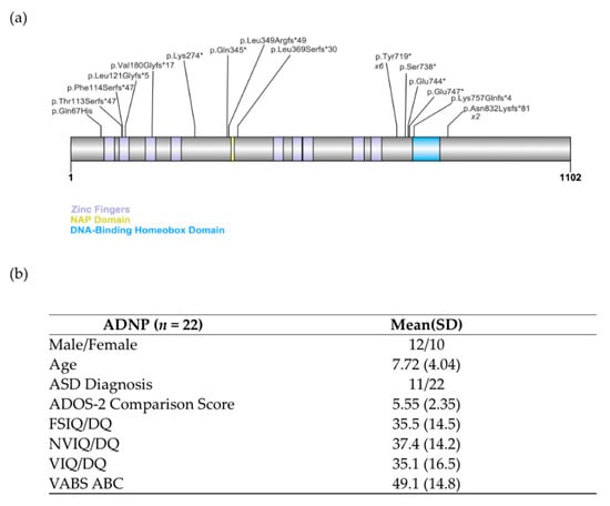 - Arnett, A.B.; Rhoads, C.L.; Hoekzema, K.; Turner, T.N.; Gerdts, J.; Wallace, A.S.; Bedrosian-Sermone, S.; Eichler, E.E.; Bernier, R.A. The autism spectrum phenotype in ADNP syndrome. Autism Res. 2018, 11, 1300–1310. [Google Scholar] [CrossRef] [PubMed]
