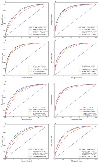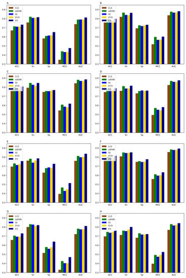 It can be seen from Figure 5 that different feature selection methods have different dimensional reduction effects on the initial feature spaces of the eleven datasets. EN has a better effect compared with the other four feature selection methods, whose ACC values corresponding to the datasets H_B, H_K, H_L, M_B, M_H, M_K, M_L, M_T, R_B, R_K, and R_L reach 73.44%, 79.84%, 80.77%, 78.90%, 75.65%, 81.51%, 73.03%, 76.16%, 78.19%, 83.21%, and 82.29%, respectively. They are 6.40%, 4.14%, 3.68%, 4.30%, 6.09%, 3.66%, 7.24%, 6.42%, 6.61%, 4.62%, and 3.94% higher than the values corresponding to LLE, respectively. Meanwhile, the ACC values of mRMR are 1.92%, 0.19%, 0.55%, 0.45%, 2.57%, 1.15%, 2.49%, 1.57%, 1.30%, 0.85%, and 0.73% lower than EN, respectively (Supplementary Table S4). Furthermore, we can clearly see that the models trained on the optimal feature subsets obtained by EN method have improved performance compared to models trained on the initial feature sets. However, compared with the models trained on the complete feature sets, the ACC and AUC values of the models trained on the feature subsets obtained by LLE method are reduced, and some similar situations also occur when using the SE and SVD methods.