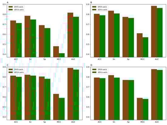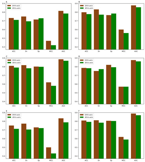 For the sake of validating the effectiveness of the DNN-m6A method in identifying m6A sites, we compare our proposed method with the state-of-the-art predictor iRNA-m6A [30]. In iRNA-m6A, physical–chemical property matrix, mono-nucleotide binary encoding, and nucleotide chemical property were used to extract features, and the classification models were constructed by SVM in fivefold cross-validation test. The prediction results comparison of DNN-m6A and iRNA-m6A on the training datasets are shown in Figure 7 and the detailed comparison results are shown in Supplementary Table S5.