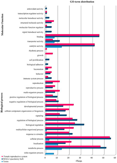 Next, we performed functional annotation of the top 100 overexpressed transcripts in the post-mating tissues based on the Gene Ontology (GO) categorization level II using the BLAST2GO tool [57] (Figure 2, Table 1). Regarding the testes transcriptome, the most abundant hits on the GO functional annotation were based on categorization level II, like those obtained from the Bactrocera dorsalis respective testes transcriptomes [60]. Regarding the classification of the molecular function (MF), the identified genes mostly fell in the main groups of “binding” and “catalytic activity”. These groups were also identified as the most abundant in similar studies in B. dorsalis [60] and C. capitata [39,48], two close relatives of the olive fruit fly, showing conservation of the functions that alter during mating in these insects. The GO terms of the male accessory glands and ejaculatory bulb tissues, in response to biological processes and the molecular function, showed an enrichment of “metabolic processes” and “biological regulation”, as in C. capitata [39]. As sexually mature males are actively involved in the pheromone response and female courting, males show a significant enrichment of these GO terms, indicating the high energy investment required in mating. Finally, the GO annotation of the upregulated genes in the lower female reproductive tract of B. oleae showed genes encoding proteases, protease inhibitors and genes related to immune response and energy metabolism that are is in accordance with the data reports in other species [34,35,48,60,61,62]. This transcriptional activity of mated female olive fruit flies is characterized by rapid cell proliferation and secretory activity, as supported by the categorization of the transcripts in functional classes related to biological regulation, metabolic and cellular processes. However, a more detailed analysis of the transcripts showed that there is diversity in the mating response among species. Specifically, compared to C. capitata, there were two distinct differences. Firstly, there was a significant increase in the number of transcripts in single mated B. oleae insects. This increase was detected only in three times mated C. capitata insects. Secondly, a transcriptional change of the immunity response of the reproductive tissues was observed in B. oleae, while no such change was observed in C. capitata [39]. Such a divergence of the reproductive genes has been shown in other species and is based on the important role that they play in ensuring successful mating and fertilization [63,64]. The comparison of D. simulans male accessory gland proteins with their orthologs in its close relative D. melanogaster demonstrated a rapid divergence of many of these reproductive genes [65].