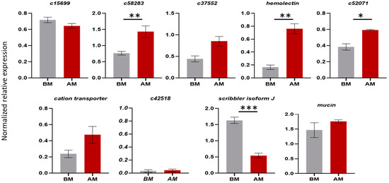 Comparison of the expression levels of genes expressed in male testes from Day 7 virgin insects before mating (BM) and testes from insects 12 h after one mating (AM). Mean values ± standard deviation (SD) of three biological replicates are shown. The * indicates significant differences, as determined by an unpaired Student’s t-test: p-value < 0.05 (*), p < 0.021 (**), p < 0.0002 (***).