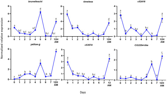 Expression profiles in male reproductive tissues. Expression profiles of the selected genes from the first day of hatching (Day 0) until Day 7. The error bars show the standard error of the mean between three biological samples. Small different letters next to the SD bars indicate statistically significant difference among different samples (p < 0.05, one-way ANOVA with Tukey’s test).