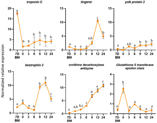 Regarding the female reproductive tract, the expression profile of the following genes was determined in Day 7-old virgin females and at six timepoints (0, 3, 6, 9, 12 and 24 h) after mating: troponin C, ornithine decarboxylase antizyme, lingerer, bestrophin-2, yolk protein-2 and glutathione S-transferase (Figure 5). We selected these genes based on their differential expression between virgin and mated flies. As it is presented in Figure 5, timepoints 7D BM (Day 7 virgin females) and 12 (12 h after one mating) are the same timepoints we used for the RNAseq analysis. In four out of the six genes, ornithine decarboxylase antizyme, lingerer, bestrophin-2 and yolk protein-2, the qRT-PCR results confirm the original findings of the RNAseq analysis. In two cases, though, troponin C and Glutathione S-transferase, the qRT-PCR results seem to contradict the RNAseq. While, in general, there is very good correlation between RNAseq results and qPCR data [84,85,86]), discrepancies may also arise. From a technical standpoint, RNAseq experiments assess the entire transcript in an unbiased manner [87], while in a qRT-PCR, only a small region of the cDNA is amplified (probe bias). In fact, it has been shown that 3′-UTRs are quite variable, and excluding them from the RNAseq data improves the consistency of the RNAseq and qRT-PCR results significantly [88]. From a biological standpoint, various types of small asynchronies in biochemical or molecular processes of the biological material could lead to differences in gene expression. For these reasons, RNAseq results are often validated by qRT-PCR, which, in addition, may be enriched with the analysis of diverse samples, capturing more details and more timepoints.