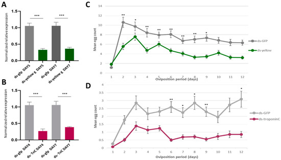 The effect of yellow-g and troponin C knockdown to oviposition. (A,B) Relative quantitative analysis of the yellow-g gene (A) and the troponin C gene (B) in the double-stranded (ds)RNA-injected B. oleae insects. Expression levels were evaluated relative to the control injections with ds-gfp. All values were normalized using Rpl19 and actin3 as the reference genes. Data are presented as means ± standard deviation (SD). Asterisks indicate the significance level of the difference between the two samples (p < 0.05, unpaired Student’s t-test). (C,D) Oviposition activity of treated females during a 12-day period. Day count starts one day after mating assay. Mean values ± standard error of triplicate data from three biological replicates is shown. (C) The mean daily egg count for the females mated with males injected with ds-yellow (green line) and males injected with ds-gfp (grey line). (D) The burgundy line shows the oviposition rate of the females injected with ds-troponin C and the grey line shows the oviposition of the control group (ds-gfp). The asterisks indicate statistically significant difference: p value < 0.05 (*), p < 0.021 (**), p < 0.0002 (***) (one-way ANOVA followed by Dunnett’s multiple comparisons test).