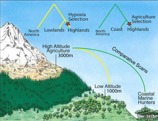 Future research may utilize ancient DNA before the population collapses to circumvent this potential issue. A gold standard study could employ DNA from individuals sampled in pre-contact populations from closely related Andean populations both from high-altitude and low-altitude regions (Figure 2). These populations were likely trading with each other given their proximity [14], and admixture between them would also need to be assessed and accounted for to avoid false-negative results. A new approach for detecting positive selection that may be particularly powerful for dealing with this type of data involves the joint assessment of admixture and allelic differentiation. The method, known as Ohana [15], could detect variants that deviate strongly in the high-altitude population from a genome-wide covariance structure created using both coastal and high-altitude populations. We describe this method further in Section 6.