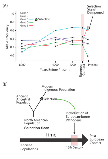 Testing the various hypotheses and scenarios posed in the article requires careful consideration of the populations utilized. Aside from requiring ancient samples with high endogenous DNA to reliably call genotypes, populations being compared across transects of time need to demonstrate genetic continuity. In other words, the researcher needs to be testing the same population through time when dealing with certain questions of adaptation. This is pertinent to questions concerning adaptation to pathogens introduced after European contact, where the researcher may test for positive selection before and after European contact (Figure 3B). On the other hand, it is possible to contrast genomic differences in ancient populations with known cultural or environmental differences to assess selection that is specific to a distinct environmental variable, which is seen in one population but not the other.