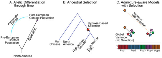 Various schemes for detecting selection in South American living and ancient populations. (A) Detecting allelic differentiation through time in a single population. (B) Detecting ancestral selection leading to adaptive phenotypes in two populations; (C) Detecting selection with admixture aware methods.