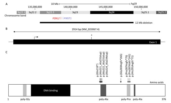 Diagram showing forkhead box L2 (FOXL2), up- and downstream genomic position, protein structure, and hotspot located in the poly-alanine domain. (A) Chromosomal deletions were reported in at least 84 blepharophimosis, ptosis, and epicanthus inversus syndrome (BPES) patients, with the largest encompassing 3q22.3 to 3q24 (12 Mb) and the smallest encompassing FOXL2 or PIRST1 genes (UCSC: hg19:chr3:133,064,629-153,716,375). (B) FOXL2 is composed of one 2.9 kb exon (NM_02367.4). The stop codon is indicated with an asterisk (*). (C) FOXL2 is a 376 amino acid protein, composed of poly-glycine (amino acid position 35–43) depicted in light grey, a DNA binding protein or forkhead (amino acid 54–148) in dark, two poly-alanine (poly-Ala) region (amino acid 221–234 and 301–304) in grey, and a poly-proline region (amino acid 284–292) in light grey (Uniprot: P58012). The most common variants (more than five patients were reported) are represented herein, which affect the highly conserved poly-alanine domain (amino acid 221–234) with c.672_701dup p.(Ala224_Ala234dup) (n = 80), c.663_692dup p.(Ala221_Ala231dup) (n = 12), and c.664_693dup p.(Ala222_Ala231) (n = 5), or the poly-proline domain (amino acid 284–292) with c.843_859dup p.(Pro287Argfs*241) (n = 46), c.855_871del p.(Pro287Alafs*241) (n = 5), and c.855_871dup p.(His291Argfs*71) (n = 15). The nonsense variant c.655C>T p.(Gln219*) and the frameshift variant c.804dup p.(Gly269Argfs*265) were reported in 6 and 10 patients, respectively.