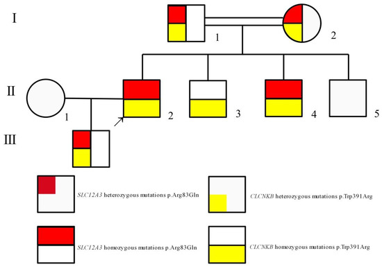 We described an exceptionally rare case in an inbred Chinese pedigree with simultaneous homozygous mutations in SLC12A3 and CLCNKB. II-2 and II-4 with simultaneous homozygous mutations in SLC12A3 and CLCNKB have phenotypes of mixed cBS and GS, and II-3 with one homozygous mutation in CLCNKB has phenotypes of cBS.
