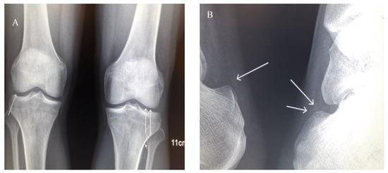 X-ray of joints. (A) Anteroposterior projections of the patient’s knees. Extensive chondrocalcinosis of the fibrocartilage of the medial and lateral menisci (arrows) is present. (B) Lateral projections of the ankles. Calcification of the Achilles tendons is present.