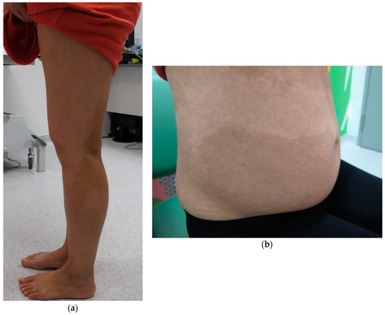 Blanschko’s line is evident on (a) the lower limbs and (b) over the abdomen; photograph taken when the patient was pregnant at 25 weeks of gestation.
