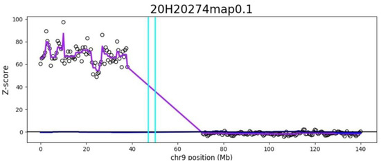 Detection of increased counts of DNA originating from chromosome 9p by genome-wide cfDNA screening post-delivery day 6. The genomic position is shown on the x-axis and the count-based z-score is shown on the y-axis. Each open circle on the plot represents a 1-Mb window. The light blue–green vertical lines mark the boundaries of the centromere. Genome-wide cfDNA screening results: increased DNA from 9p24.3-p13.1:1-38,500,000, count-based z-score of 70.