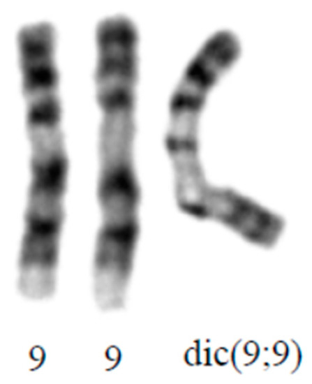 - Sait, S.N.; Wetzler, M. Tetrasomy 9p with no Apparent Phenotypic Characteristics. Am. J. Hum. Genet. 2003, 73, 285. [Google Scholar]