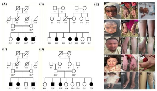 Family D: The affected females (IV-3 and IV-8) and the affected male (IV-2) of Family D displaying ichthyosis vulgaris phenotypes, were born to healthy consanguineous parents with congenital erythroderma, mild peeling and dryness of the skin with moderate severity especially, in the groin region and lower legs. On examination, both the members showed generalized mild, dry and whitish to light brown scaly flakes on the skin, prominent on the extensor surfaces of limbs, lower abdomen, foot and soles. Whitish seborrheic plaques were also visible on the extremities. The affected individuals also showed erythema of skin, keratoderma, pruritus, atopic dermatitis, allergic rhinitis, allergic rhinoconjunctivitis, hypohidrosis, heat intolerance, and recurrent infections [Figure 1E(n–q)]. See (Table 1).