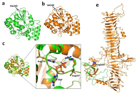 (a) Homology model of wild and (b) mutant type of SULT2B1 protein. Residues at position 140 are shown in stick model. (c) The superimposed structure of wild (green color) and mutant (yellow color) SULT2B1. (d) The zoom-up view of PAP binding site in wild type and mutant display difference sin distance which suggest the p. Ala140Val may contribute to the cofactor binding. (e) Homology model of FLG from residues 1960–2854. The residue Arg2037 is shown with sphere representation. The orange color ribbon is absent in the p. Arg2037Ter (mutant form).