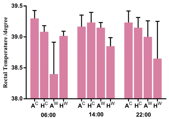 Rectal temperature of Altay and Hu lambs maintained at different air temperatures. The rectal temperatures of the lambs were measured on day 36 of the study at 06:00, 14:00 and 22:00. Ac: Altay lambs at −5 °C, Hc: Hu lambs at −5 °C, Aw: Altay lambs at 20 °C, and Hw: Hu lambs at 20 °C. Values are means ± SD from 6 lambs per group.
