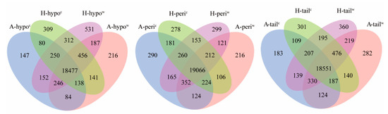 Venn diagrams representing annotated genes in hypothalamus tissue, tail-fat tissue and perirenal fat tissue of cold-exposed Altay and Hu lambs; A-hypoc: hypothalamus tissue of −5 °C Altay lambs; H-hypoc: hypothalamus tissue of −5 °C Altay lambs; A-hypow: hypothalamus tissue of 20 °C Altay lambs; H-hypow: hypothalamus tissue of 20 °C Hu lambs. A-peric: perirenal fat tissue of −5 °C Altay lambs; H-peric: perirenal fat tissue of −5 °C Altay lambs; A-periw: perirenal fat tissue of 20 °C Altay; H-periw: perirenal fat tissue of 20 °C Hu lambs. A-tailw: tail-fat tissue of −5 °C Altay lambs; H-tailc: tail-fat tissue of −5 °C Altay lambs; A-tailw: tail-fat tissue of 20 °C Altay lambs; H-tailw: tail-fat tissue of 20 °C Hu lambs.