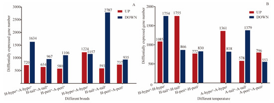 The expression of DEGs in hypothalamus tissue, tail-fat tissue and perirenal fat tissue of cold-exposed Altay and Hu lambs. (A) DEGs expressed in Altay and Hu lambs at same air temperature and tissues. (B) DEGs expressed at different air temperature (−5 °C and 20 °C) within the same breed and tissues. All the compared groups used Hu and thermo-neutral Altay lambs as control groups. H-hypow-A-hypow: hypothalamus tissue of the 20 °C Altay lambs compared to the 20 °C Hu lambs. H-tailw-A-tailw: tail-fat tissue of the 20 °C Altay lambs compared to the 20 °C Hu lambs. H-periw-A-periw: perirenal fat tissue of the 20 °C Altay lambs compared to the 20 °C Hu lambs. H-hypoc- A-hypoc: hypothalamus tissue of the −5 °C Altay lambs compared to the −5 °C Hu lambs; H-tailc-A-tailc: tail-fat tissue of the −5 °C Altay lambs compared to the −5 °C Hu lambs. H-peric-A-periw: perirenal fat tissue of the −5 °C Altay lambs compared to the −5 °C Hu lambs. H-hypow-H-hypoc: hypothalamus tissue of the −5 °C Hu lambs compared the 20 °C Hu lambs. H-tailw-H-tailc: tail-fat tissue of the −5 °C Hu lambs compared the 20 °C Hu lambs. H-periw-H-peric: perirenal fat tissue of the −5 °C Hu lambs compared the 20 °C Hu lambs. A-hypow-A-hypoc: hypothalamus tissue of the −5 °C Altay lambs compared the 20 °C Hu lambs. A-tailw-A-tailc: tail-fat tissue of the −5 °C Altay lambs compared the 20 °C Hu lambs. A-periw-A-peric: perirenal fat tissue of the −5 °C Altay lambs compared the 20 °C Hu lambs.