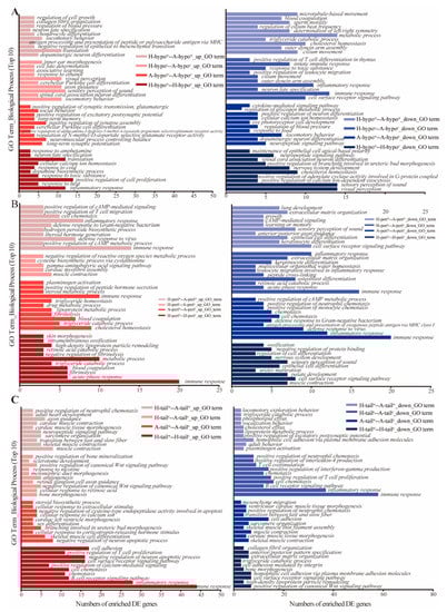 Top 10 up- and down-regulated DEGs enriched GO terms in different tissues and sheep breeds under cold exposure. (A): GO terms enriched in the hypothalamus, (B): GO terms enriched in the perirenal fat tissue, (C): GO terms enriched in the tail-fat tissue. H-hypow- A-hypow: hypothalamus tissue of the 20 °C Altay lambs compared to the 20 °C Hu lambs. H-hypoc- A-hypoc: hypothalamus tissue of the −5 °C Altay lambs compared to the −5 °C Hu lambs. H-hypow-H-hypoc: hypothalamus tissue of the −5 °C Hu lambs compared to the 20 °C Hu lambs. A-hypow-A-hypoc: hypothalamus tissue of the −5 °C Altay lambs compared to the 20 °C Hu lambs. H-tailw-A-tailw: tail-fat tissue of the 20 °C Altay lambs compared to the 20 °C Hu lambs. H-tailc-A-tailc: tail-fat tissue of the −5 °C Altay lambs compared to the −5 °C Hu lambs. H-tailw-H-tailc: tail-fat tissue of the −5 °C Hu lambs compared to the 20 °C Hu lambs. A-tailw-A-tailc: tail-fat tissue of the −5 °C Altay lambs compared to the 20 °C Hu lambs. H-periw-H-peric: perirenal fat tissue of the −5 °C Hu lambs compared to the 20 °C Hu lambs. H-periw-A-periw: perirenal fat tissue of the 20 °C Altay lambs compared to the 20 °C Hu lambs. H-peric-A-periw: perirenal fat tissue of the −5 °C Altay lambs compared to the −5 °C Hu lambs. A-periw-A-peric: perirenal fat tissue of the −5 °C Altay lambs compared to the 20 °C Hu lambs.