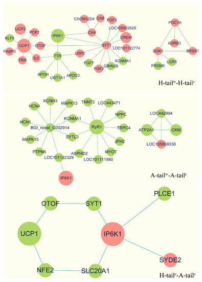The interaction of proteins between different groups in the tail-fat of cold-exposed Altay and Hu lambs. Red circles represent up-regulation of genes, green circles represent down-regulation of genes. A-tailc: tail-fat tissue of −5 °C Altay lambs; H-tailc: tail-fat tissue of −5 °C Altay lambs; A-tailw: tail-fat tissue of 20 °C Altay lambs; H-tailw: tail-fat tissue of 20 °C Hu lambs.