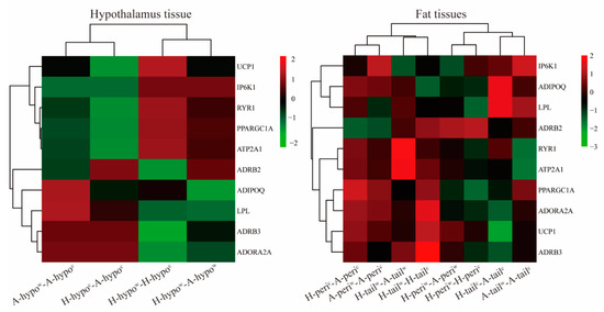 The heat map of candidate gene clustering in the hypothalamus and fat tissues. H-hypow- A-hypow: hypothalamus tissue of the 20 °C Altay lambs compared to the 20 °C Hu lambs. H-hypoc- A-hypoc: hypothalamus tissue of the −5 °C Altay lambs compared to the −5 °C Hu lambs. H-hypow-H-hypoc: hypothalamus tissue of the −5 °C Hu lambs compared to the 20 °C Hu lambs. A-hypow-A-hypoc: hypothalamus tissue of the −5 °C Altay lambs compared to the 20 °C Hu lambs. H-tailw-A-tailw: tail-fat tissue of the 20 °C Altay lambs compared to the 20 °C Hu lambs. H-tailc-A-tailc: tail-fat tissue of the −5 °C Altay lambs compared to the −5 °C Hu lambs. H-tailw-H-tailc: tail-fat tissue of the −5 °C Hu lambs compared to the 20 °C Hu lambs. A-tailw-A-tailc: tail-fat tissue of the −5 °C Altay lambs compared to the 20 °C Hu lambs. H-periw-H-peric: perirenal fat tissue of the −5 °C Hu lambs compared to the 20 °C Hu lambs. H-periw-A-periw: perirenal fat tissue of the 20 °C Altay lambs compared to the 20 °C Hu lambs. H-peric-A-periw: perirenal fat tissue of the −5 °C Altay lambs compared to the −5 °C Hu lambs. A-periw-A-peric: perirenal fat tissue of the −5 °C Altay lambs compared to the 20 °C Hu lambs. Candidate genes were clustered with log2 changes (log2 FC >1, p < 0.05) in all compared groups included in this heatmap. Hierarchical clustering of samples was based on Pearson’s correlation coefficient, and scales were performed in rows. FC, fold change.