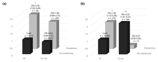 The relative odds ratio of osteoporosis according to oophorectomy and (a) MYLK rs12163585 and (b) PTGS1 rs1213265 genotypes. The ORs (95% CI) of the genetic correlation between dominant/homozygous genotypes of each gene and ovariectomy are shown. The homozygous model was set as the reference allele. p-values were adjusted for age and residential area by analysis of covariance. * p < 0.05, ** p < 0.01. Abbreviations: OR, odds ratio; CI, confidence interval.