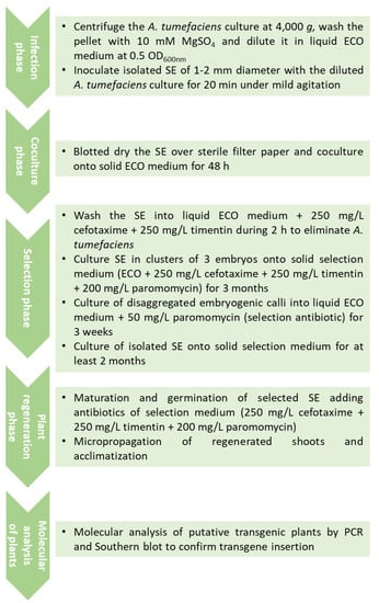 In a different approach, isolated globular SE were employed for inoculation with A. tumefaciens and a selection phase in liquid medium was introduced []. Briefly, SE (1–2 mm diameter) were incubated with the diluted bacterial suspension, blotted dry over sterile filter paper, and cultured on solid embryogenic medium (ECO) for 48 h in darkness. After co-culture, SE were washed for 2 h with liquid ECO medium containing cefotaxime and timentin, each at 250 mg/L, to restrict bacterial growth. Then, the globular embryos were transferred to solid selection medium, ECO medium with cefotaxime, timentin and paromomycin at 200 mg/L. After 3 months of culture, disaggregated embryogenic calli resistant to paromomycin were cultured in liquid ECO medium supplemented with 50 mg/L paromomycin for 3 weeks. Then, calli were filtered and globular embryos were cultured individually on solid ECO selection medium with 200 mg/L paromomycin for at least two additional months. Somatic embryos surviving this exposure were considered to be transgenic. In this study, the authors evaluated the effect of bacterial strain and binary vector on transformation efficiency. The best results were obtained with the hypervirulent A. tumefaciens strain AGL1 and the plasmid pBINUbiGUSInt, a combination that yielded transformation rates higher than 10% based on GUS assays. Additionally, the incubation of the Agrobacterium inoculated embryos in small clusters of three units during the selection in solid medium slightly increased the transformation efficiency. This treatment probably allowed transformed embryos with a low level of expression of the selectable marker gene to withstand the selection pressure. Maturation was carried out using cellulose acetate membranes [], while for germination, a basal medium with low sucrose and a diluted salt formulation [,], as previously described for non-transgenic material, was used, although it was supplemented with the same concentration of selective antibiotic to assure the recovery of transgenic plants. The transgenic nature of olive plants was confirmed by both polymerase chain reaction (PCR) amplification and Southern blot analysis. All putative transgenic plants showed PCR amplification of a fragment of the nptII gene; regarding the Southern blot analysis, 1–3 copies of the transgene were found in the different transgenic lines analyzed []. One of the embryogenic lines used for transformation did not yield any transgenic callus [], which points out the important effect of the genotype in the transformation process. A workflow chart of this protocol is shown in Figure 2.