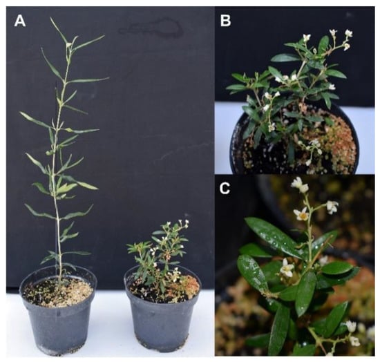 As in most woody species, the long juvenile period in olive, usually longer than 10 years, is one of the main bottlenecks in breeding programs. The overexpression of flowering genes, such as Flowering Locus T (FT), in transgenic plants shortens the juvenile period and induces continuous flowering. FT is expressed in the leaves under appropriate environmental conditions, and the protein is translocated via the phloem to the meristem, inducing flowering. FT overexpression has been attempted in a few woody species [,,]. The use of these early flowering plants has been proposed as a novel method to reduce the generation time in woody species, accelerating breeding programs. In this system, called fast track breeding, an early flowering transgenic plant containing a single copy of the transgene is crossed with a parent line harboring the trait of interest. Offspring showing early flowering and the desired phenotype are selected and backcrossed with the elite commercial line. This process is repeated several times but, in the last backcross, early flowering plants are discarded, selecting the individuals with the desired trait but free of early flowering transgenes. Thus, improved plants devoid of transgenes could be generated in a short time. The proof-of-concept of this system was performed to obtain apple plants resistant to fire blight []. With the aim of accelerating the onset of flowering in olive, globular SE of a “Picual” embryogenic line were transformed with the FT gene from Medicago truncatula, MtFTa1, under the control of the CaMV35S promoter []. Some of the transgenic plants overexpressing MtFTa1 showed the flowering of apical meristems in vitro. After acclimatization, plants of one of these transgenic lines flowered throughout the entire year in the glasshouse, with flowers being more abundant in spring (Figure 4). The growth pattern of the plants in some FT transgenic lines was altered, with a profuse axillary branching and reduced size []. Two of these lines showed the profuse branching phenotype but did not form flowers.