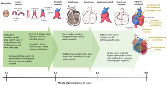 Broadly speaking, CHD can be considered as the consequence of normal cardiac development gone awry. Heart development or cardiogenesis, is a complex developmental process (Figure 1) governed by multiple interlinked and dose-dependent pathways []. Owing to the complexity of the developmental processes governing morphogenesis of the heart, impairment in any of these steps understandably leads to CHD. These events increase the difficulty of identifying and characterizing the genetic risk factors for CHD, and emphasizes the importance of understanding cardiogenesis at the molecular level. Therefore, an overview of the cardiac developmental events and their transcriptional regulation (Figure 2) would be pertinent to provide context to understanding the developmental defects causing CHD.