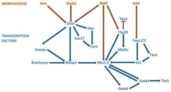 Morphogens and transcriptional factors regulating cardiac cell lineage and differentiation. Note: Blue arrows indicate activation; red arrows indicate inhibition.