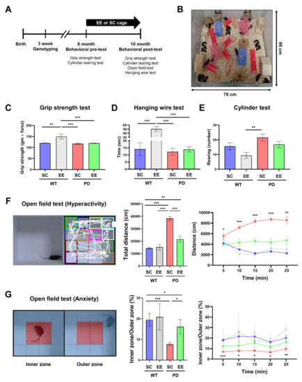 Environmental enrichment (EE) ameliorates hyperactivity and anxiety but not motor function in human A53T(hA53T) alpha-synuclein (α-Syn) mice. (A) Experimental scheme. (B) EE (86 × 76 × 31 cm3). (C) The grip strength test (wild-type (WT)- standard cages (SC), n = 5; WT-EE, n = 10; Parkinson’s disease (PD)-SC, n = 10; PD-EE, n = 10). (D) The hanging wire test (WT-SC, n = 5; WT-EE, n = 5; PD-SC, n = 10; PD-EE, n = 10). (E) The cylinder test (WT-SC, n = 10; WT-EE, n = 8; PD-SC, n = 10; PD-EE, n = 16). (F, G) Open field test conducted in a square area (30 × 30 × 30 cm3). The floor was divided into 16 sectors. The four red sectors represent the inner zone, and the 12 blue sectors represent the outer zone. (F) Open field test for hyperactivity (WT-SC, n = 12; WT-EE, n = 3; PD-SC, n = 15; PD-EE, n = 12). (G) Open field test for anxiety (WT-SC, n = 10; WT-EE, n = 3; PD-SC, n = 12; PD-EE, n = 11. The values represent the mean ± SEM. * p < 0.05, ** p < 0.01, and *** p < 0.001.