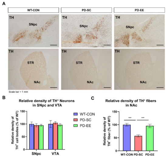 Immunostaining was performed to analyze TH-positive cell density to investigate whether dopaminergic nerve terminals in the NAc were degenerated at 10 months of age and examine the effects of EE exposure on dopaminergic nerve terminals. Immunostaining results showed that the number of dopaminergic nerve terminals in the striatum decreased significantly in mice from the PD-SC and PD-EE groups, compared to that in the mice from the WT control group (Figure 2C).