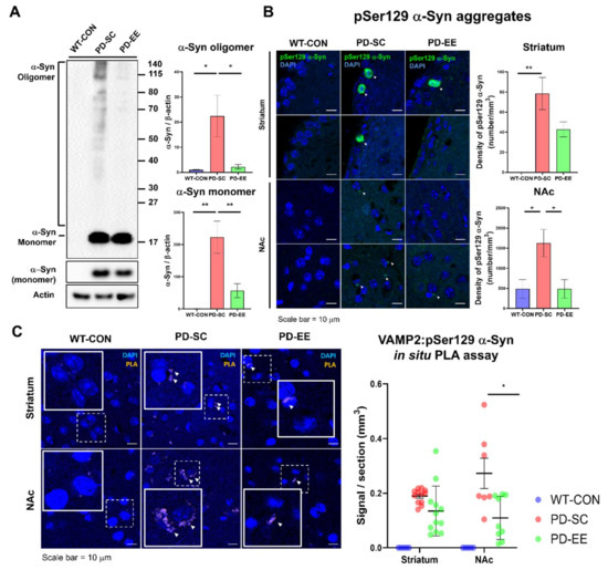 EE reduced the levels of aggregated α-Syn and the interaction between α-Syn and VAMP-2 in the NAc of hA53T α-Syn-overexpressing transgenic mice. (A) Western blot results indicated the relative expression levels of the α-Syn monomer and oligomer. The expression of the α-Syn monomer tended to increase but that of aggregated α-Syn decreased in samples from mice in the PD-EE group, compared to those in the samples from mice in the PD-SC group (n = 5, each). (B) Representative images of pSer129 α-Syn immunohistochemistry in the striatum and NAc of the mice from three groups. The density of pSer129 α-Syn tended to decrease in samples from mice in the PD-EE group compared to that in the samples from mice in the PD-SC group in both regions (scale bar = 10 μm, striatum: WT control group (WT-CON), n = 5; PD-SC, n = 8; PD-EE, n = 6; NAc: WT-CON, n = 5; PD-SC, n = 6; PD-EE, n = 5). (C) The proximity of VAMP2 and pSer129 α-Syn in the striatum and NAc, assessed by proximity ligation assay, showed decreased PLA signals in samples from mice in the PD-EE group, relative to that in samples from mice in the PD-SC group (scale bar = 10 μm, striatum: n = 4 each; NAc: WT-CON, n = 4; PD-SC, n = 3; PD-EE, n = 3). * p < 0.05, ** p < 0.01 versus WT-CON; one-way ANOVA followed by post-hoc comparison. Data in all panels represent the mean ± SEM.
