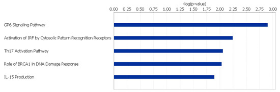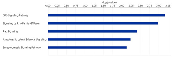 Glycoprotein VI (GP6) Signaling, Signaling by Rho Family GTPases, Rac Signaling, Amyotrophic Lateral Sclerosis Signaling, and Synaptogenesis Signaling were the top 5 canonical pathways found to be significantly affected within the HS line (p-value < 0.01) (Figure 1; Supplementary Material S3). In the LS line, the canonical pathways found to be significantly affected (p-value < 0.05) include GP6 Signaling, Activation of Interferon-Regulatory Factor (IRF) by Cytosolic Pattern Recognition Receptors, Th17 Activation, Role of BRCA2 (BRCA2, DNA repair associated) in DNA Damage Response, and IL-15 Production (Figure 2; Supplementary Material S4).