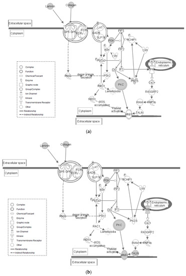 (a) GP6 Signaling Pathway in HS line of Japanese quail. Molecular interactions within the given pathway are shown. Grayed symbols indicate genes containing SNP mutations while white symbols indicate genes that do not contain SNPs but are functionally associated within the pathway. Each symbol represents the given molecule’s function. (b) GP6 Signaling in LS line of Japanese quail. Molecular interactions and symbols within the pathway are the same as described in Figure 3a.