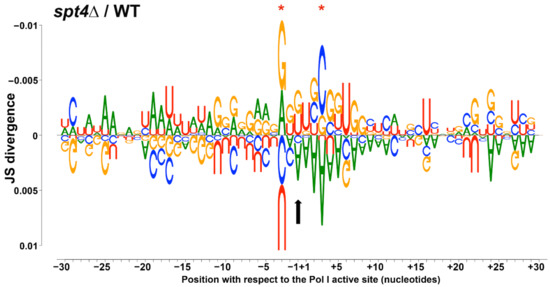 To test for sequence-specific effects on Pol I occupancy, sequence logos (Figure S1) for both the WT and spt4△ yeast strains were generated. For ease of interpretation, we created a logo displaying a summary of the differences in sequence patterns observed between the two strains (Figure 3). Figure 3 and Figure S1 display sequence preferences for the top 2.5% occupied positions in the rDNA, both 30 nucleotides up- and downstream of the last incorporated nucleotide (LNT; black vertical arrow, Figure 3). In Figure 3, nucleotides that are overrepresented in the WT strain are displayed below the x-axis, whereas those overrepresented in the spt4△ yeast with respect to WT are shown above the axis. The degree of difference between the two strains at each position is proportional to the size of the nucleotide.
