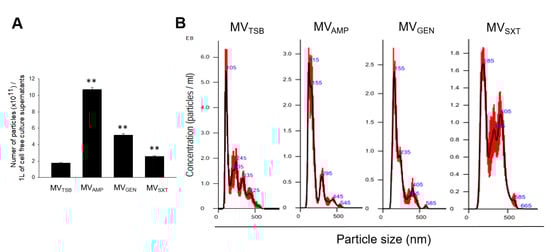 Production of membrane vesicles (MVs) in L. monocytogenes cultured under antibiotic stress conditions. Bacteria were grown to late exponential phase (OD600 of 1.4). MVs were then isolated from bacterial culture supernatants. Nano particle tracking analysis (NTA) was performed to determine the number and size of MVs. (A) Particle numbers of MVTSB, MVAMP, MVGEN, and MVSXT in 1 L of cell free culture supernatants. Data are presented as mean ± SD of three independent experiments. **, p < 0.01 compared to MVTSB. (B) Size distribution of MVTSB, MVAMP, MVGEN, and MVSXT based on NTA. Data are representative of three independent experiments with similar results.