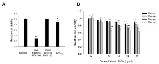 Cytotoxicities of bacteria and MVs from L. monocytogenes cultured with or without antibiotics to Caco-2 cells. (A) L. monocytogenes was cultured in TSB to reach 1.0 at OD600. Caco-2 cells were then treated with live bacteria at multiplicity of infection (MOI) 100, dead bacteria at MOI 100, and MVTSB (10 μg/mL) for 24 h. Dead bacteria were prepared by fixation with 10% formalin for 20 h. (B) Caco-2 cells were treated with various concentration of MVAMP, MVGEN, or MVSXT for 24 h. Cell viability was determined using an MTT assay. Data are presented as mean ± SD of three independent experiments. *, p < 0.05; **, p < 0.01 compared to untreated control cells.