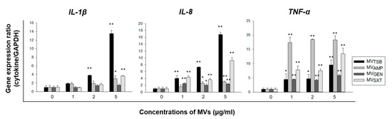 To determine whether MVs from L. monocytogenes cultured under antibiotic stress conditions could trigger an innate immune response in vitro, Caco-2 cells were treated with 1, 2, or 5 μg/mL of MVTSB, MVAMP, MVGEN, or MVSXT for 4 h. Expression levels of pro-inflammatory cytokine genes (such as IL-1β and TNF-α) and chemokine gene such as IL-8 were analyzed using qPCR. As shown in Figure 4, MVTSB significantly stimulated the expression of IL-1β and IL-8 genes compared with other MVs, whereas the expression level of TNF-α gene was significantly higher in cells treated with MVAMP than in cells treated with MVTSB, MVGEN, or MVSXT. MVSXT induced more expression of TNF-α gene than MVTSB. These results suggest that sub-inhibitory concentrations of antibiotics can alter MV-induced pro-inflammatory responses in Caco-2 cells. Furthermore, sub-inhibitory concentrations of AMP affected the ability of L. monocytogenes MVs to induce pro-inflammatory response by altering the expression level of TNF-α in Caco-2 cells.