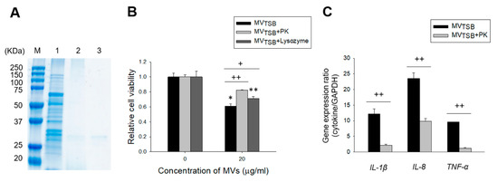 Data were analyzed using R 3.3.4 (https://www.r-project.org/, accessed on 15 November 2020). Expression levels of genes were analyzed using a one-way analysis of variance (ANOVA) with Dunnett’s post hoc analysis. Student’s t-test was used to determine statistical significance of cell viability and cytokine gene expression between intact MVs and proteinase K- or lysozyme-treated MVs. Differences were considered statistically significant at p < 0.05.