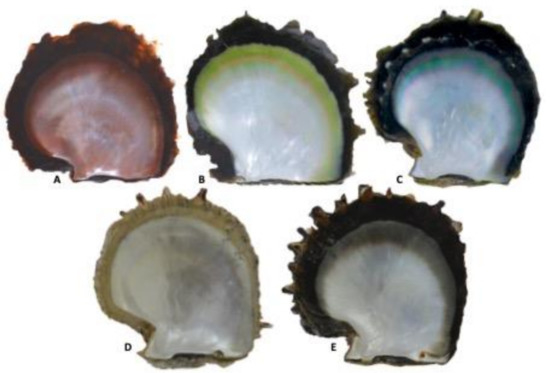 Different colors of P. margaritifera inner shell: (A): red, (B): yellow, (C): green, (D): albino, (E): black.