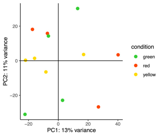 Differences in gene expression were analyzed by pairwise comparison of color phenotypes using DESeq2. In total, 71,059 genes were expressed with at least one read counted. Among these expressed genes, 64, 72 and 84 DEGs were identified (False Discovery Rate, FDR < 0.05) for the red vs. yellow, red vs. green, and yellow vs. green pairwise comparisons, respectively (DEGs for all pairwise comparisons are given in Supplementary Materials Tables S6–S8. With this approach, we hypothesized that a DEG present in two pairwise comparisons would be more likely to be associated with the phenotype present in both of these pairwise comparisons. We, therefore, drew Venn diagrams that identified 24 DEGs (18 over-represented, 6 under-represented) shared between the red vs. yellow and between red vs. green, 7 DEGs (4 over-represented 3 under-represented) shared between the red vs. yellow and yellow vs. green, and 19 DEGs (10 over-represented, 9 under-represented) shared between the red vs. green and yellow vs. green comparisons (Figure 3D). Among these DEGs, 16 red-associated, 3 yellow-associated, and 11 green-associated genes encode proteins of unknown function.