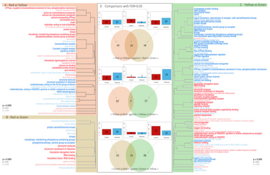Three RBGOA analysis were performed: (i) red vs. yellow (Figure 3A), (ii) red vs. green (Figure 3B), and (iii) yellow vs. green (Figure 3C). Significantly enriched GO terms (p value < 0.01) were identified for each paired color combination: 45 GO terms for the comparison of red vs. yellow (27 over-represented and 18 under-represented), 16 GO terms for red vs. green, (7 over-represented and 9 under-represented), and 89 GO terms for yellow vs. green (36 over-represented and 53 under-represented). Among these enriched molecular functions, several belonged to pathways already known to be involved in pigmentation or biomineralization in various organisms [48,49,50]: “hydroxymethylbilane synthase activity” [48] (GO:0004418; under-represented in red vs. yellow), “oxidoreductases, acting on the CH-CH group of donors” [49,50] (GO:0016627; under-represented in red vs. yellow, but over-represented in yellow vs. green), “UDP-glycosyltransferase activity” [49] (GO:0008194; under-represented in yellow vs. green), and “UDP-glucosyltransferase activity” [49] (UGTs) (GO:0035251; under-represented in red vs. green and in yellow vs. green). The pterin and Raper–Mason pathways are also known to produce pigments [51,52,53], and molecular functions characteristic of these pathways were also significantly enriched. These included “GTPase activity” (GO:0003924) and “oxidoreductase, acting on NAD(P)H” (GO:0016651), both of which had a higher amount of transcripts in red vs. yellow and yellow vs. green; “monooxygenase activity” (GO:0004497), “tetrapyrrole binding” (GO:0046906), and “quinone binding” (GO:0048038), all over-represented in yellow vs. green; “phosphotransferase, alcohol group as acceptor” (GO:0016773), under-represented in yellow vs. green; “transferase activity, transferring alkyl or aryl (other than methyl) groups” (GO:0016765) and “glutathione transferase activity” (GO:0004364), both over-represented in yellow vs. green.