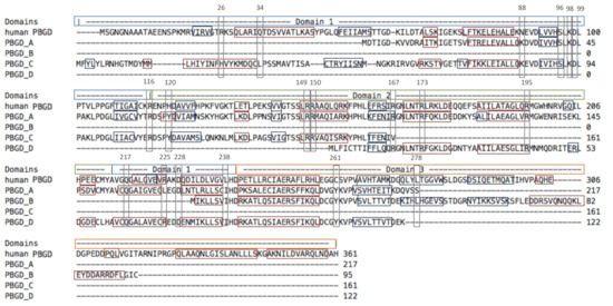 At the primary structure level, the sequences were 306, 217, 95, 161, and 122 amino acids long for human PBGD and the four P. margaritifera PBGD (A to D), respectively (Figure 4). P. margaritifera PBGD_A to _D displayed 54.3%, 30.3%, 37.4%, and 42.6% of similarity with human PBGD, respectively. Alignment with human PBGD produced scores of 273, 69, 120, and 122 and coverage of 66%, 21%, 32%, and 33% (e-value 5e-91, 2e-14, 2e-32, and 2e-33) for PBGD_A to D, respectively. Based on these results, the four P. margaritifera PBGD can be considered as homologous to human PBGD [57].