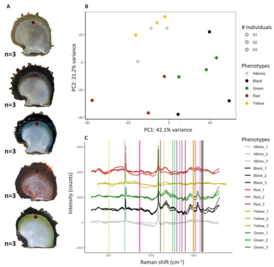 In this study, our aim was to identify the main pigments and pigment-producing pathways likely responsible for three economically major inner shell colors in P. margaritifera: red [22], yellow [22], and green [23] (Figure 1). Color-specific populations were farmed and reared in a common garden to limit confounding environmental effects. Their transcriptomes were compared by an RNA-seq approach to reveal differential gene expression among different pigment-producing pathways. The presence of the hypothetic pigments we identified from this transcriptomic approach was tested using Raman spectroscopy on the shells, which permits a direct and specific chemical characterization method. The joint use of these two methods led us to confidently identify both the pigments and the pathways underlying pearl oyster inner shell color phenotypes.