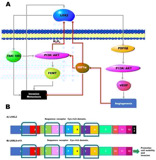 Several splice variants of LOXL2 have been reported in various cancers, including esophageal squamous cell carcinoma. Two isoforms—the exon 13-free form (Figure 3B) and the form containing a 72-nucleotide-deletion—result in tumor progression through a new molecular mechanism distinct from the canonical model for LOXL2 [51,52]. This alternate LOX2 mechanism involves the activation of signaling pathways, such as focal adhesion kinase (FAK) and protein kinase B (PKB), and leads to the transition from epithelial to mesenchymal tissue [53]. Overexpression of the isoform lacking exon 13 activated these pathways to a higher degree in HPV-negative HNSCC patients; this includes both the focal adhesion kinase (FAK) and protein kinase B (PKB) pathways. This is associated with modifications in p-FAK, p-AKTT308, p-AKTS473 and p-S6 (Phospho-S6 Ribosomal Protein) [54]. Therefore, it is predicted that this LOXL2 splice variant may promote the proliferation, migration, and invasion of HPV-negative HNSCC cells [54].