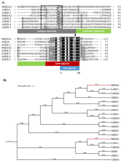Protein sequence alignment of MiIDAs with Arabidopsis IDA/IDL proteins (A), and phylogenetic relationships between MiIDA and other IDA proteins (B). (A) Alignment was performed using the ClustalW2 program (https://www.genome.jp/tools-bin/clustalw (accessed on 15 August 2018)) with manual adjustment using GeneDoc (MSA editor and shading utility version 2.7.000). The amino acid sequences of MiIDA1 (QGF19396.1), MiIDA2 (QGF19397.1), AtIDA (NM_105550.1), AtIDL1 (NM_113464.2), AtIDL2 (NM_001085327.2), AtIDL3 (NM_001085091.1), AtIDL4 (NM_001084711.1) and AtIDL5 (AY642386.1) were aligned. The signal peptide, the variable region of the extended PIP domain (EPIP) and conserved PIP domain are marked with rectangles. The arrowhead indicates residues at position 10 of the PIP domain. (B) Phylogenetic relationships among the mango, lychee, citrus and Arabidopsis IDA proteins. MiIDA1, MiIDA2 LcIDL1 (Lychee_GLEAN_10054315), LcIDL2 (Lychee_GLEAN_10027620), LcIDL3 (Lychee_GLEAN_10009234), AtIDA, AtIDL1, AtIDL2, AtIDL3, AtIDL4, AtIDL5, AtIDL6 (NM_120612.1), AtIDL7 (AK118348.1), AtIDL8 (AK221754.1), CitIDA1 (Ciclev10017342m), CitIDA2 (Ciclev10033211m), CitIDA3 (Ciclev10033191m), CitIDA4 (Ciclev10003011m), and CitIDA5 (Ciclev10026873m) sequences were used. Bootstrap consensus trees were inferred from 100 replicates and graphically designed with iTOL (Interactive tree of life. V5) https://itol.embl.de/ (accessed on 15 August 2018). Branch lengths are indicated.