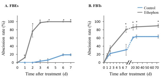 Effect of ethephon treatment on rates of mango fruitlet abscission in fruitlet-bearing explants (FBE) (A) and fruitlet-bearing trees (FBT) (B). (A) Fruitlet abscission was induced with ethephon using three experimental units of FBE, each composed of 110–120 explants. Three untreated experimental units served as controls. The number of intact fruitlets in each experimental unit was monitored at several time intervals, and abscission rates were calculated. Values represent the means + SE of three biological replicates. (B) Four trees were sprayed with ethephon to induce abscission, and four control trees were sprayed with surfactant alone. The number of intact fruitlets in each tagged panicle was monitored at several time intervals, and abscission rates were calculated. Values represent means + SE of 60 counts (15 panicles X 4 trees per treatment). Asterisks (*) denote significant differences between ethephon-treated and control explants or trees at each sampling point (p ≤ 0.05).